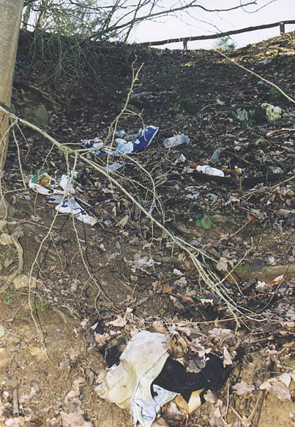 Vom Parkplatz herabgeworfener Müll.